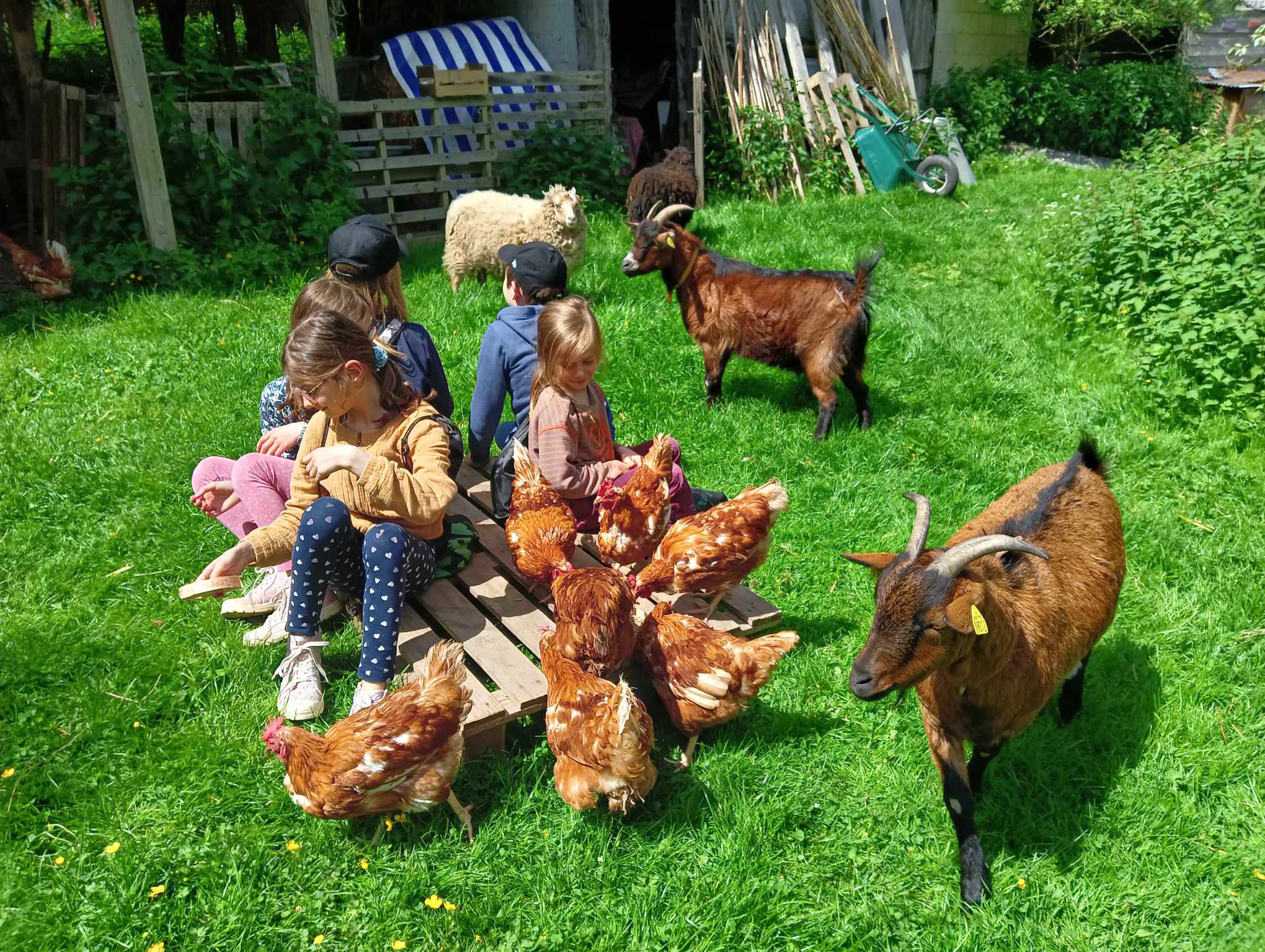 Poules, cochons d’Inde, brebis et boucs attendent leurs caresses, nourritures et paille toute propre pour un lit douillet…