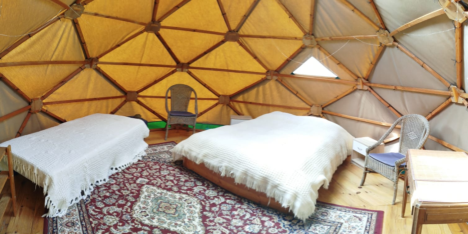 Structure à géométrie énergétique de 15 m², en bois et toile marine sur un plancher en bois.